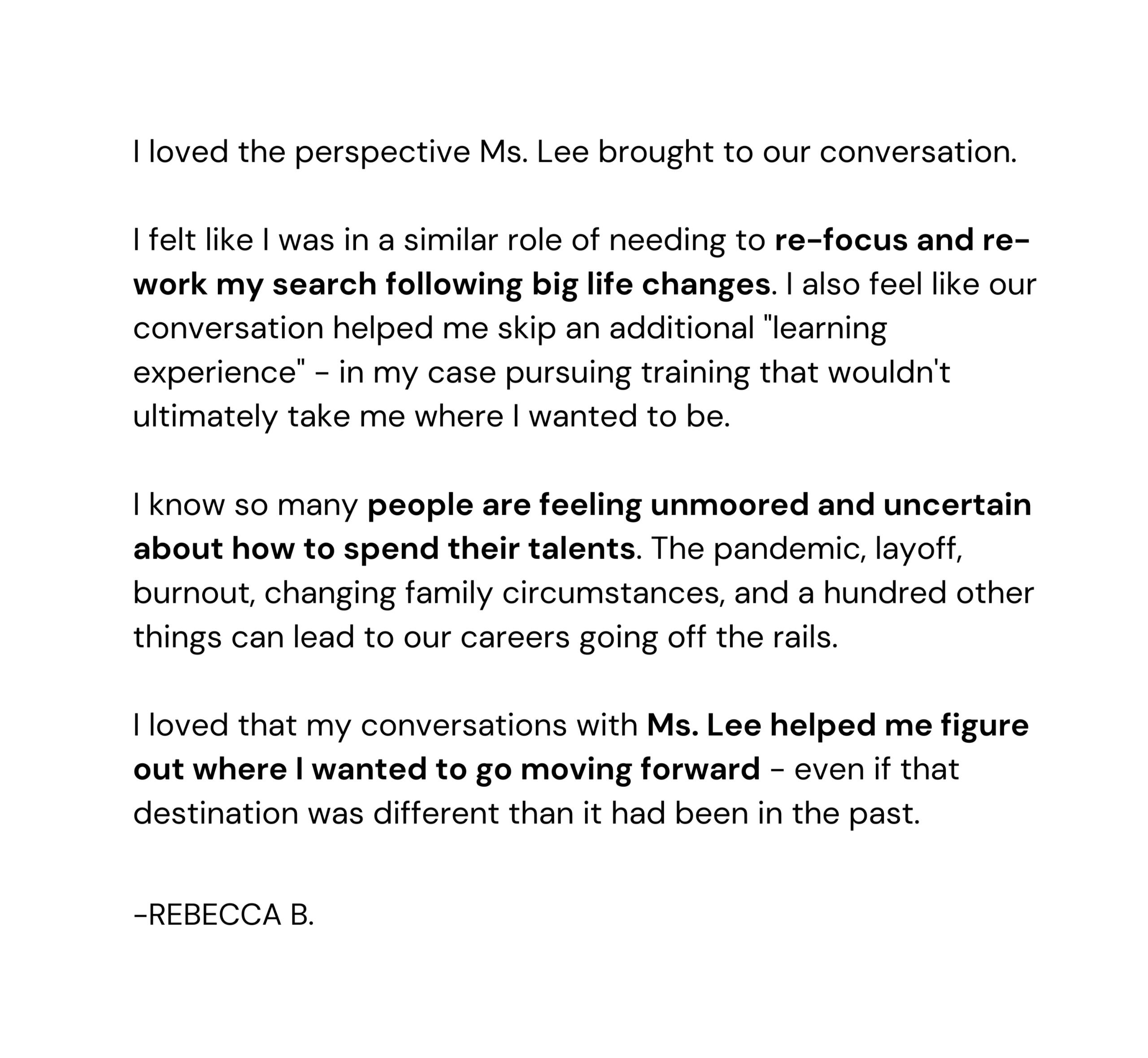 I like to do things differently, even if it means I won't be "as successful."I get bored easily. I switched my career several times. I became so good at pivoting that I turned it into a business.💡 Biggest ah-ha: the career shift isn't the hard part, it's the identity shift and the nuances that come with it.I'm weirdly good at remembering the seemingly trivial details. Great for my clients because I can piece together the puzzle they can't see for themselves. Terrible for my anxiety when these details keep me up at night.I'm a teacher by trade but after I peaked too early in my career (yep, another millennial who burned out), I left it all behind to lead with my gut rather than a pre-defined checklist. I'm an oxymoron in that way; perfectionist and planner by heart, but also a calculated risk-taker.Over the last ten years, my gut has taken me all over the world (over 40 countries). I nourished my inner creative and I grew my wealth despite the international moves, disruptions in my career, and global pandemic.I've never been good at sticking to one thing; I want to try it all. And instead of forcing myself to pick one thing and pick one label, I committed to the practice of good enough and trusting myself.I'm the healthiest (and most dangerous) I've ever been in my life.My mission is to help more women build the ideal lifestyle that makes them feel whole. And it starts with putting themselves first.Because when women take care of themselves, communities thrive. Period.I know that I'm fulfilling this mission when my clients don't panic when shit goes sideways, when they stop questioning how to find balance, and they aren't white-knuckling their way through stressful periods.Because they found peace and power in just being. They trust themselves and the systems we put in place to protect them and the ones they love.That's the gift of good enough.